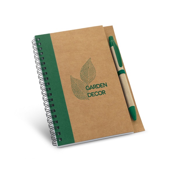 Acest notes include un suport pentru pix si un pix din carton reciclat cu accesorii asortate color