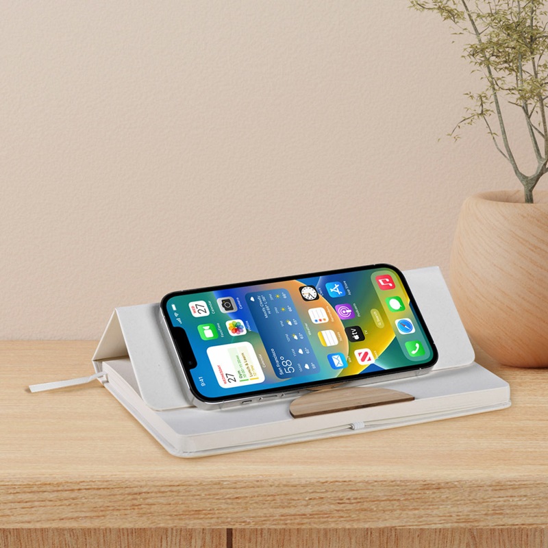 Bloc notesul are coperta fata pliabila pentru a tine un telefon mobil